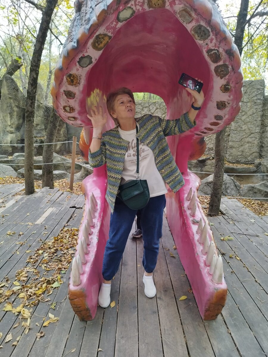 И так субботний день прошёл на ура. На фото я в пасти динозавра, и пытаюсь изобразить испуг. Внук в восторге, он остался за кадром, но помогал мне как мог. Взял палку, где он её нашёл не поняла, и пытался подыграть, отважно набросился на динозавра.