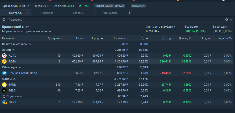 После покупок активов с вычетом всех комиссий брокеру и убытков от продаж прибыль составляет 308,11 рублей(5,18%).