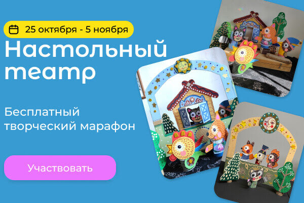 Участие в марафоне «Настольный театр» бесплатное, надо только зарегистрироваться >> Сказка начинается Итак, с 25 октября по 5 ноября ждём всех на самом сказочном творческом марафоне «Настольный театр».