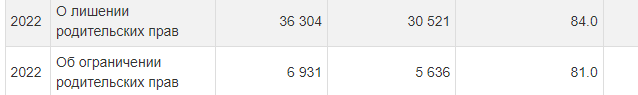 Число детей, родители которых были лишены родительских прав, в 2021 г. составило 32 684, в 2020 г. – 28 746, в 2022 году из 36 тысяч запросов на лишение было удовлетворено 84%. То есть 30,5 тысяч родителей были лишены, а 5,6 тысяч ограничены в родительских правах...