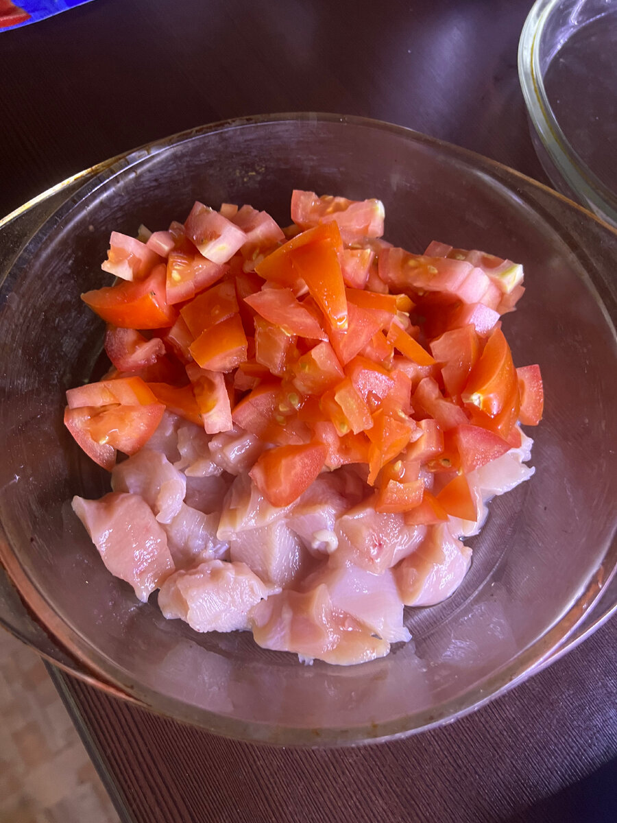 Легкий рецепт, быстрый в приготовлении Из ингредиентов нам нужны: Филе куриное 2 шт 1 крупный помидор или 2 средних Сыр 200г Майонез (примерно 4-5 столовых ложек) 2 яйца Соль, специи по вкусу Приготовление: Филе помыть и нарезать на кусочки, выложить в форму, заранее смазанную маслом (у меня растительное) Помыть и нарезать помидор, добавить к курице Добавить специи и соль, перемешать Теперь готовим соус, нужно натереть сыр, и смешать его с майонезом и яйцами Готовый соус должен быть густым, выглядит это так Далее соусом заливаем курицу, можно перемешать, или как я оставить ‘шубу’ Ставим в предварительно разогретую на 180 градусов духовку на 40-50 минут Готово! Подавать можно как самостоятельное блюдо, или с любым гарниром Готовьте, кушайте) Приятного аппетита <3