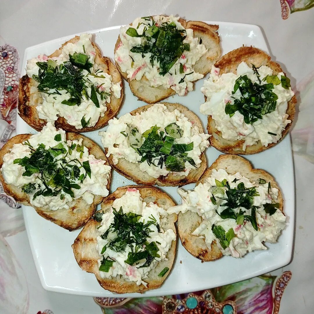 Ингредиенты: Багет - 1шт; Крабовые палочки - 5шт.; Яйцо варёное - 2шт. ; Колбасный сыр - 80гр.; Чеснок - 2-3 зубчика; Майонез 2 ст.л.; соль по вкусу. Способ приготовления: 1) Палочки, яйцо и колбасный сыр натереть на средней терке. Чеснок натереть на мелкой терке или чеснокодавилку. 2) В миске смешать продукты с добавилением майонеза и соли. 4) Багет нарезать на ломтики ~1 см и обжарить на сковороде с небольшим количеством масла /сделать в тостере/ на гриле. 5) полученную смесь выкладываем на готовые тосты, украшаем зеленью и подаем к столу. Приятного аппетита
