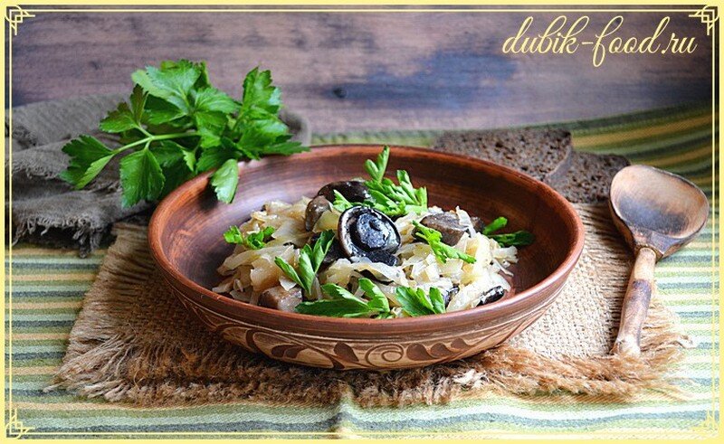 На масле обжарить лук и грибы. Капусту нашинковать соломкой.