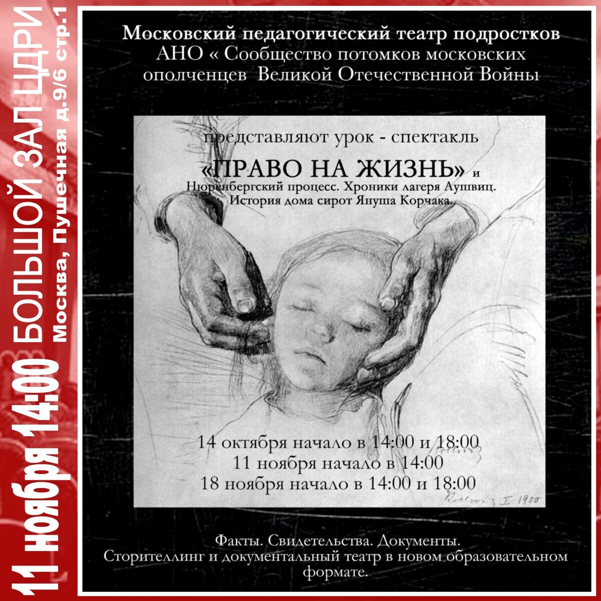 Сторителлинг и документальный театр в новом образовательном формате. Московский педагогический театр подростков Автор спектакля, художественный руководитель театра, лауреат премии президента в области образования — Вадим ЗЛОТНИКОВ Педагог и режиссер театра — Александра КУЗНЕЦОВА Урок-спектакль из циклов спектаклей «Уроки истории» посвященных памяти о подвиге Московского народного ополчения в Битве за Москву. Тема урока-спектакля – нацизм, военные преступление во время Второй мировой войны, гражданский и человеческий выбор, хроника лагеря Аушвиц (Освенцим), в котором находились в плену некоторые московские ополченцы, попавшие в Вяземское окружение в октябре 1941 года, история дома сирот Януша Корчака. «Право на жизнь» — это документально-театральный проект Московского педагогического театра подростков, основанный на фактах, свидетельствах и докум