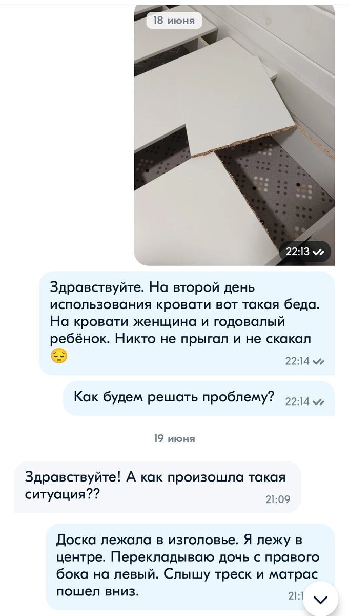 Купили в спальню кровать. Максимально простую по своей конституции, без ящиков и достаточно низкую. В тот момент мне казалось, что в такой кровати просто нечему ломаться! Но на второй день матрас резко прогибается с громким «хрясь!». Я с нескрываемым удивлением смотрю на переломанное пополам основание. «150 кг на одно спальное место» — гласит описание в карточке товара. Я конечно пышечка, но до критической массы мне еще далеко. Пишу продавцу, заявку принимают и... начинаются хождения по мукам. 20 июня со мной связались из отдела рекламации, чтобы оформить заказ на замену бракованной детали. Менеджер предупредила меня, что деталь придётся ждать примерно месяц. Я честно дотерпела до сентября и снова написала в компанию. С этого момента наше общение шло по кругу. Примерно так: Или так: В конце октября стало уже совсем не смешно, и я запросила данные для отправки заявления в уполномоченные органы. Только после этого к ситуации проявили интерес. Буквально через час позвонила девушка, изви