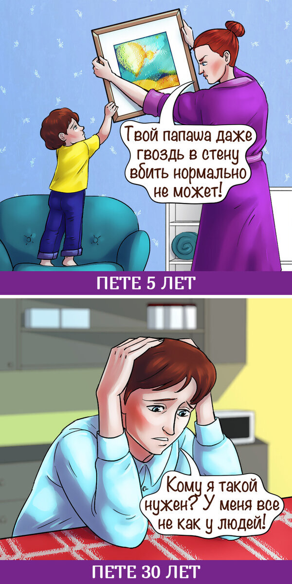 Многие родители привыкли воспитывать ребёнка лишь упрёками и сравнением, выставляя малыша в плохом свете. Но не многие задумываются, что такого рода воспитание не даёт никаких положительных результатов, а лишь пагубно влияет на самооценку ребёнка и доставляет ему чувства неуверенности. Давайте разберём несколько примеров фраз, которые ни в коем случае нельзя говорить ребёнку, если вы хотите избежать плохих последствий воспитания. 1. Нелестные высказывания по отношению к супругу во время воспитания ребёнка не даст никакой пользы, а лишь поможет родителю выплеснуть негативные эмоции. Подобные фразы заставят человека в будущем бесконечно сомневаться в себе. 2. Обесценивание чувств ребёнка учит его не смелости и стойкости, а дальнейшему обесцениванию чувств окружающих. Подобные фразы показывают, что чужие проблемы не имеют никакой важности и можно от них отмахнуться. 3. Когда родитель понимает, что пора уходить с детской площадки, а ребёнок до последнего не собирается идти домой, многие ре