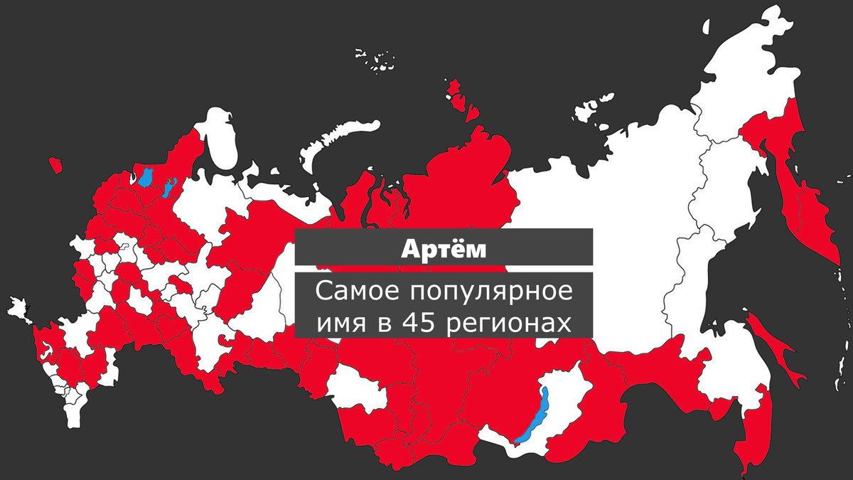 Согласно видео ниже самыми популярными именами в России для новорожденных являются София (1 место 63 региона) и Артём (1 место в 45 регионах):
