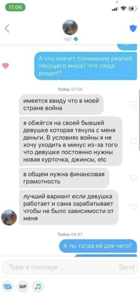 Поэтому да, как на скриншоте. “В условиях войны я не хочу уходить в минус из-за того, что девушке постоянно нужны новая курточка, джинсы, еtс.”