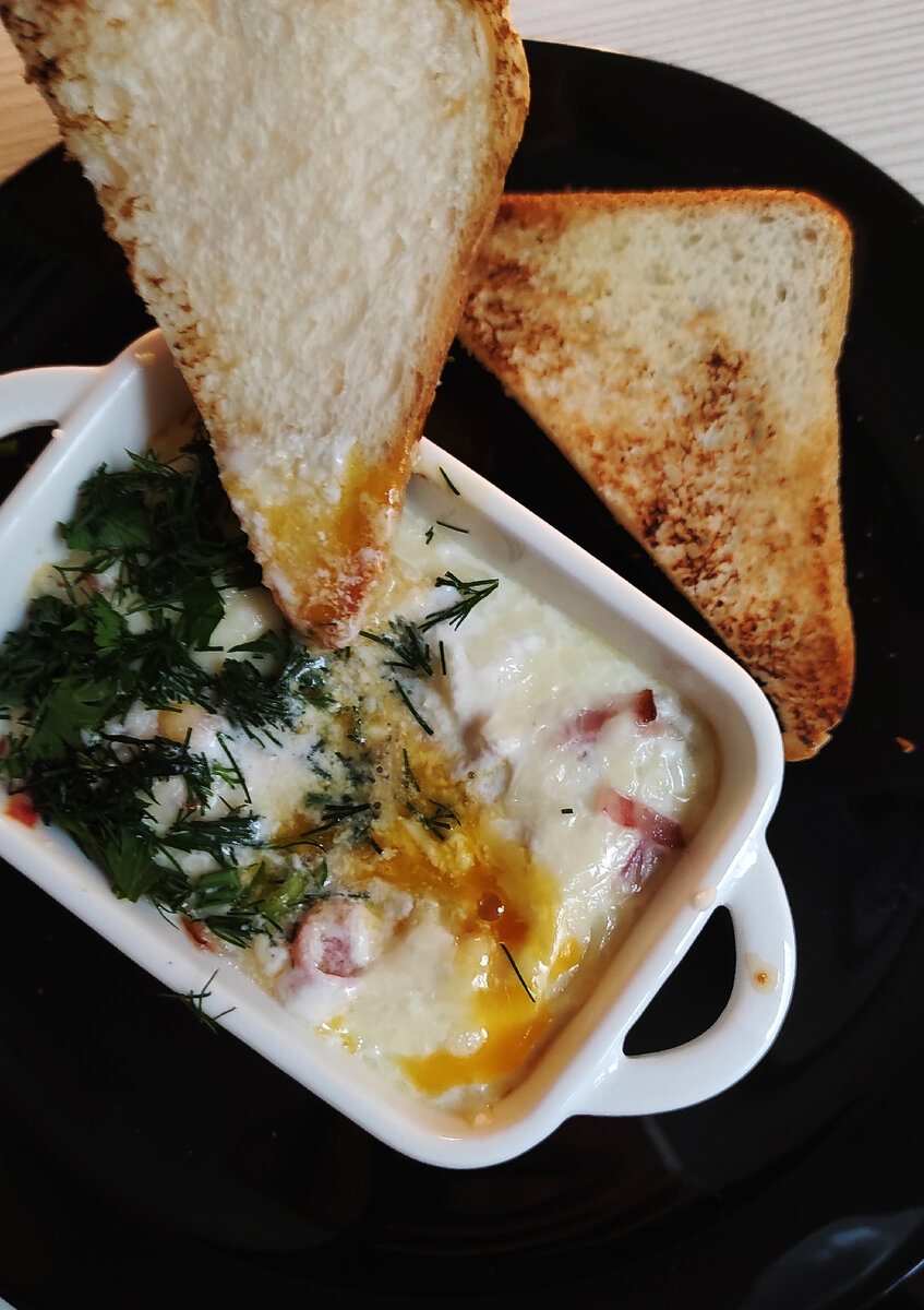 Зелень по вкусу. Яйца нужно разбить в форму для запекания, туда же добавить немного сливок, нарезанный соломкой бекон и сверху все засыпать тертым сыром. Выпекать в духовке при 180 градусах, 10-15 минут.