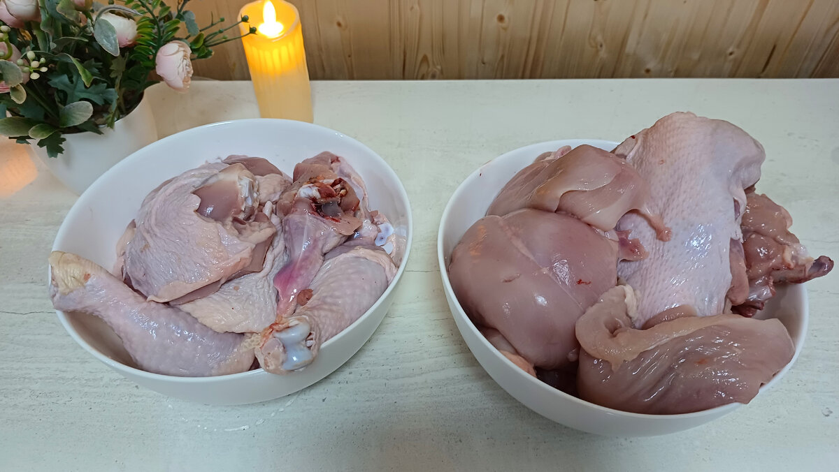 Мне нравится, когда в морозилке есть заготовки. Я не очень люблю полностью приготовленную и замороженную еду, а полуфабрикаты иногда делаю. У меня было две средних курицы. Я их разделала и поделила на очень простые заготовки. Бедра, голени и крылышки замариновала. Добавила соль, черный перец, измельченный чеснок. Заправила майонезом, перемешала. Вторую часть посолила, добавила красный и черный молотый перец (выбирайте ваши любимые специи). Перемешала. Разложила в пакеты и заморозила. Это наборы для супа. Специально оставила больше мяса. Это спинки и ребрышки. Получилось три порции. Тоже убрала в пакеты и заморозила. Куриные оладьи. Филе грудки я измельчила, сделала рубленый фарш. Добавила измельченный чеснок и лук. Посолила, добавила специи. Еще добавила столовую ложку муки, куриное яйцо. Все хорошо перемешала. Просто на растительном масле жарить куриные оладьи с двух сторон до готовности, на медленном огне. А пока можно отправить фарш в морозилку. Можно сразу сформировать котлетки.