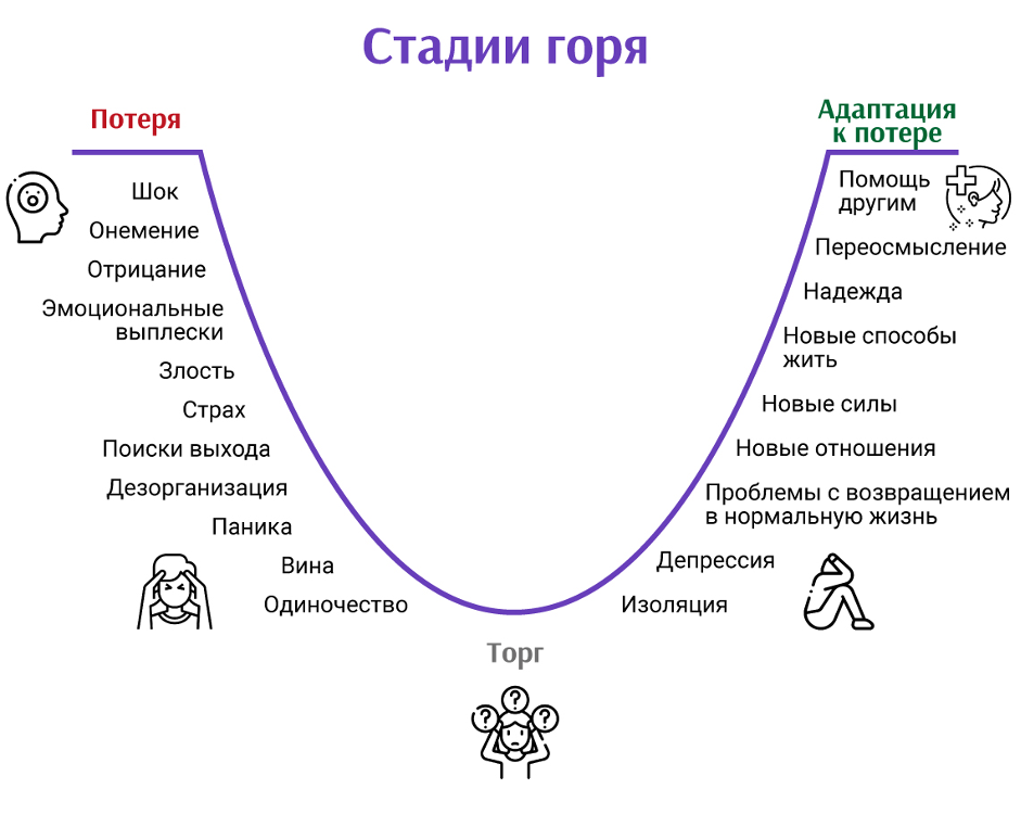 💔Горе случается неожиданно. Утрата близких всегда большой стресс. Быть готовым к нему невозможно. ✔️В подобных ситуациях сложно не только тому, кто переживает утрату, но и тем , кто находится рядом. Близкие соболезнуют, но как дальше вести себя, как правильно поддерживать зачастую не знают и теряются. ❌Вопросы жизни и смерти всегда задевают базовые потребности и опоры выживания, безопасности и т.п. Поэтому, подробные ситуации затрагивают всех в той или иной степени. ✅Как правильно поддерживать в ситуации потери близких? Понимать, что это ситуация горя и горевать нормально, нужно и важно. Это естественный процесс проживания того, что произошло. Без этого "пути" принять смерть близкого, мягко говоря, сложно. Нет правил, как горевать. Каждый проживает горевание по-своему. И это "ПРАВИЛЬНО". ✔️Горевание имеет свои этапы и длительность. Если отгоревать не получилось "вовремя", значит нужна помощь специалиста. Иначе оно становится разрушительным для личности - дистресс. СТАДИИ ГОРЯ (одна из