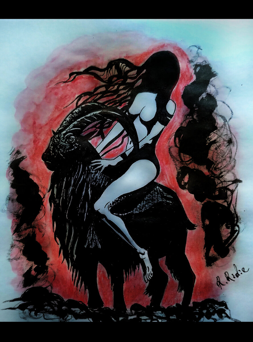 Секси-ведьма, на мощном чёрном козлище, собралась на шабаш.🤘🔥🐐