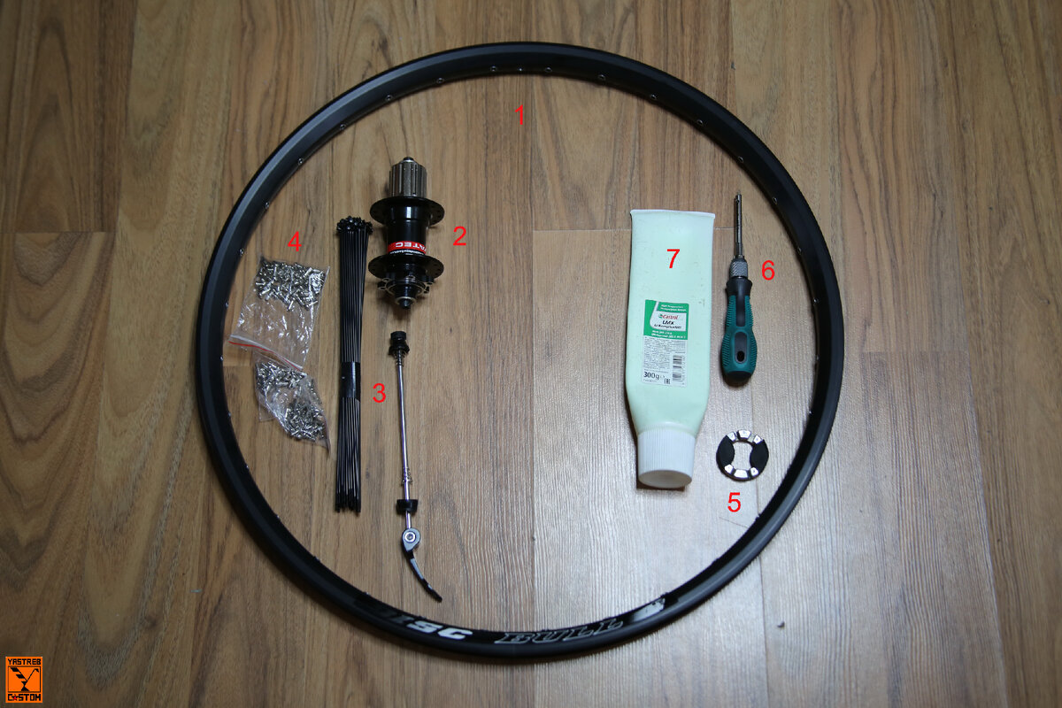 Итак, для спицовки колеса нам понадобятся следующие компоненты: