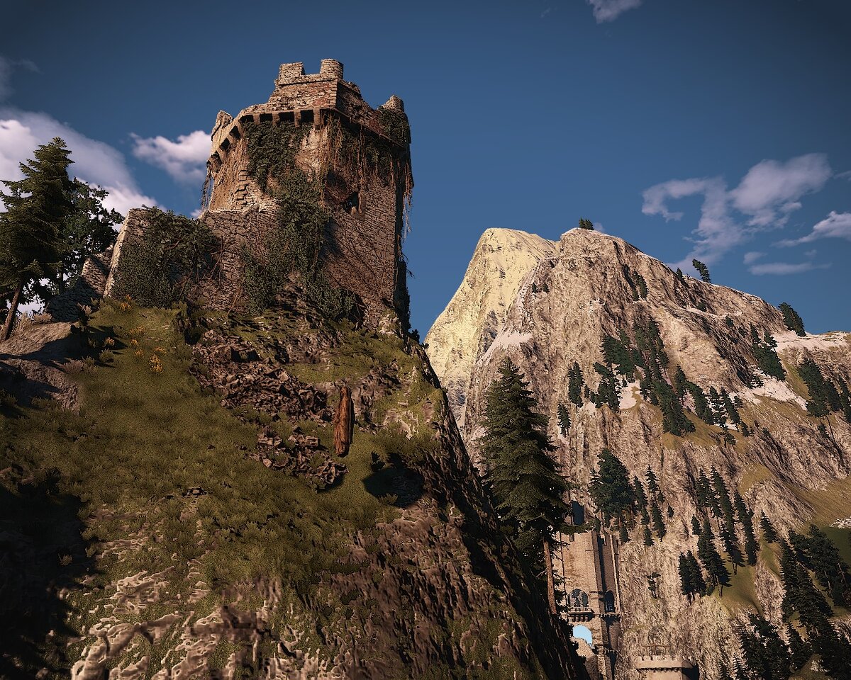Начнём наш обзор с сигнальной башни, расположенной на высокой горе, неподалёку от стен замка. Как все прочие строения Каэр Морхена, она сильно пострадала при осаде и в настоящий момент находится в плачевном состоянии. Маршрут обзора построен таким образом, чтобы попутно была возможность выполнить дополнительный квест «Ведьмачьи древности: снаряжение Школы Волка».