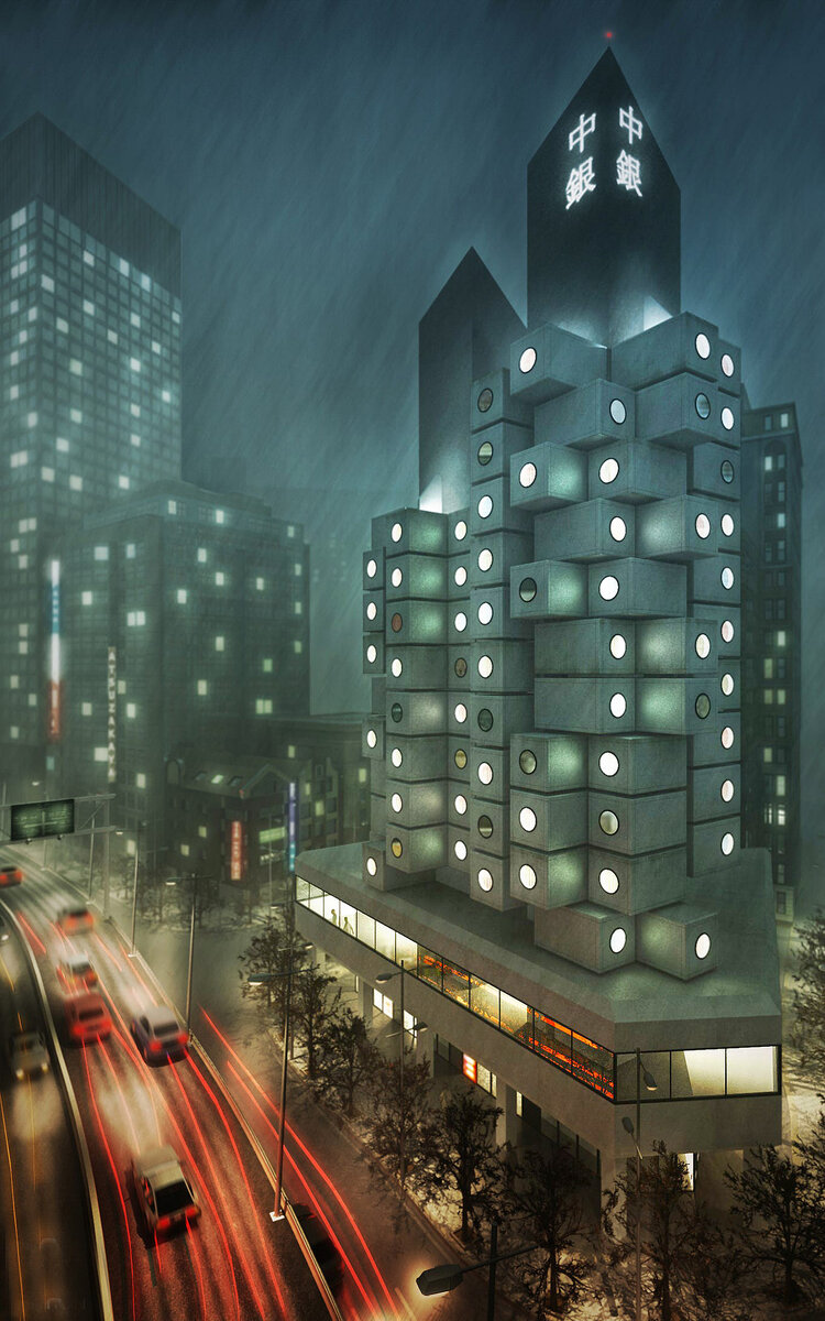 Проект Капсульной башни «Накагин» был реализован в 1972 году в районе Гинза в Токио, где находится множество офисов. В Японии существует культ на переработки, поэтому иметь рядом с местом работы маленькое по площади, но наполненное по функционалу жилое помещение – мечта бизнесменов и офисных работников. Кисё Курокава отразил в своей работе жизнь японца, его культуру и фантазии о футуристическом городе будущего.