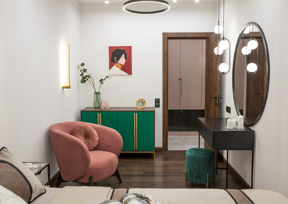 К дизайнеру Яне Васильевой обратилась молодая женщина с просьбой спроектировать интерьер квартиры для нее и ее взрослого сына. Работа над проектом началась еще до сдачи дома. Изначально для гостиной было предназначено очень узкое помещение в конце коридора — всего 230 см. В связи с этим гостиную сделали в центре квартиры и поставили сдвижные двери, чтобы не скрадывать пространство коридора. Нам достались не очень широкие комнаты и несколько несущих колонн, которые удалось успешно скрыть. Например, в прихожей часть шкафов является обманкой и маскирует неудачную планировку, в гостиной колонну обыграли зеркалами и расположенными на ней рейками из МДФ, а в нише за колонной скрылся барный шкафчик. Из-за близко расположенных соседних домов полупрозрачные рулонные шторы на окнах все время закрыты, поэтому у нас много осветительных приборов и разнообразных сценариев освещения. Решено было объединить два санузла и убрать одну дверь. В результате перепланировок получилось удобное и функционально