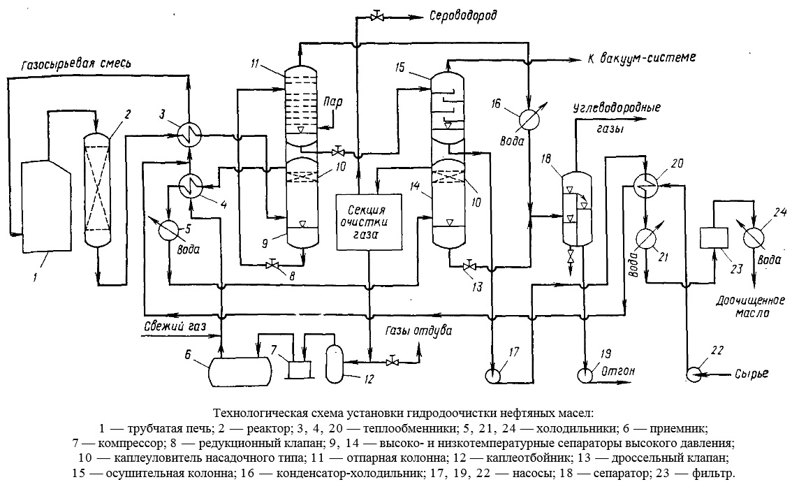 Многие установки гидродоочистки нефтяных масел имеют три параллельные взаимозаменяемые технологические линии для одновременной раздельной доочистки трех масел разной вязкости. Эти линии обслуживаются общей секцией очистки циркуляционного газа от сероводорода, а также общей системой для проведения периодической окислительной регенерации катализатора.