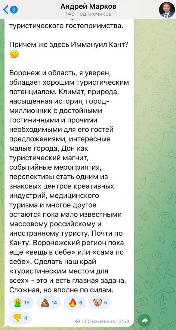 Почему-то ему не понравилась такая реакция. Депутат Государственной Думы от Воронежской области от партии «Единая Россия» Андрей Марков, не так давно побывавший на дне профильного табеля и всё чаще получающий в СМИ звание «бесполезный», снова отличился в работе со своими избирателями. На этот раз Андрей Павлович обрубил и без того бедную коммуникацию с народом. В его скромном телеграм-канале (149 подписчиков на момент написания текста) были отключены комментарии, но пользователи могли хотя бы выразить отношение к той или иной теме при помощи реакции. Нравится — ставь лайк. Не нравится — есть довольно широкий арсенал и для этой ситуации. После поста о том, как Андрей Марков принял участие в "круглом столе" на тему туризма в Воронежской области, на народного избранника посыпались не дизлайки, а эмоджи в виде какашки. Что же так не понравилось избирателям Андрея Павловича? А они, судя по всему, и составляют большую часть подписчиков. Ведь, как мы помним, в 2021 году таинственный недуг пор