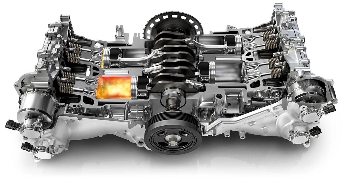 Сначала о тех положительных моментах, которые свойственны горизонтально-оппозитным моторам. Конструкция двигателя представляет собой два полублока с двумя цилиндрами (или тремя в случае 6 цилиндрового мотора) в каждом, где расположенные под углом 180° поршни перемещаются в горизонтальной плоскости. При этом два соседних поршня всегда находятся в одинаковом положении относительно головки блока. Такое решение позволяет минимизировать вибрации, а значит, отказаться от дополнительных балансиров.