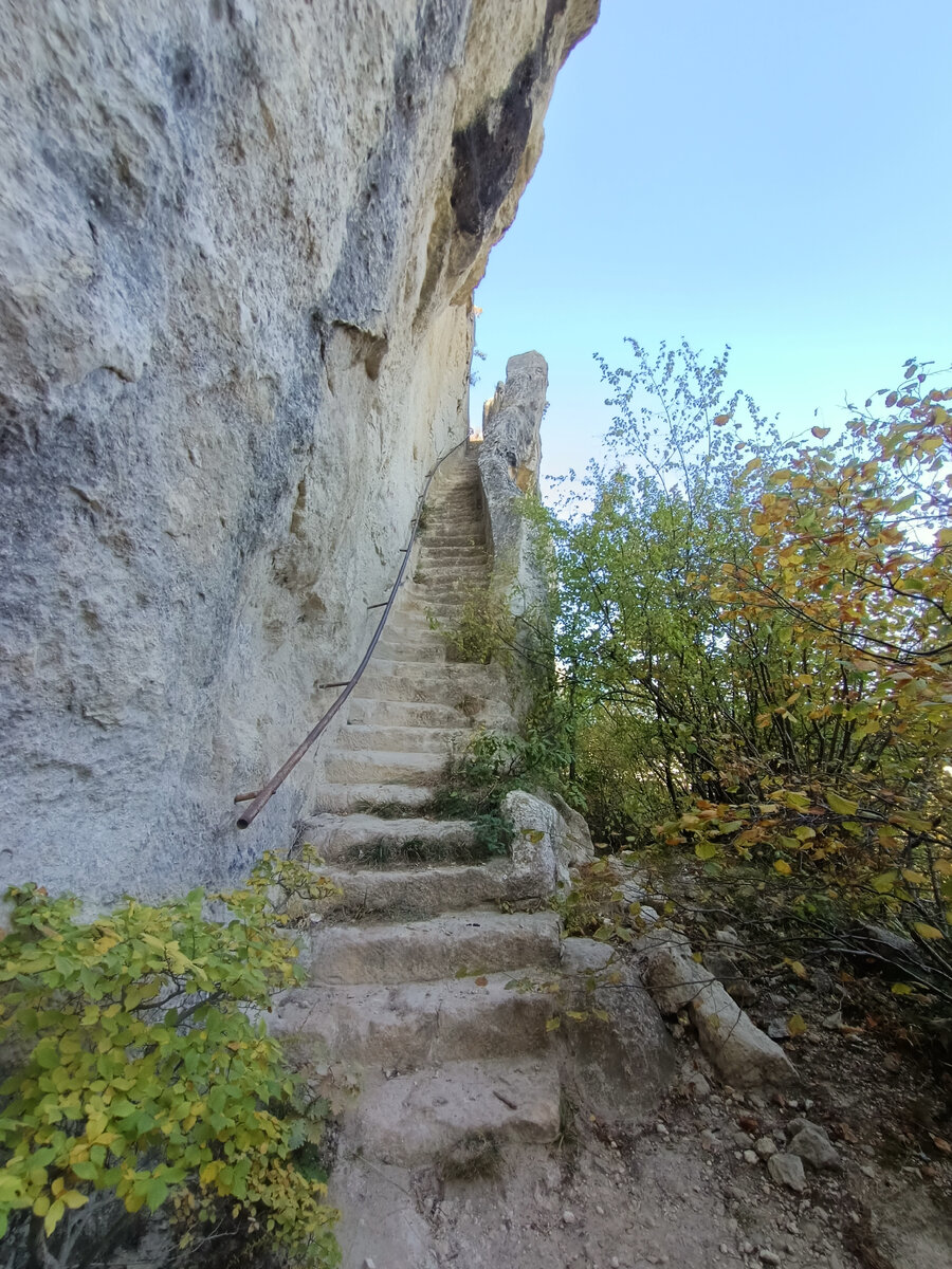 Окрестности Чуфут-Кале и Свято-Успенского монастыря близ Бахчисарая облазил почти все. Есть там один объект, о котором слышал много, рассказывали знакомые, но не удавалось попасть на каменную секретную лестницу, что спускалась с плато к монастырю. Рассказывают, что выдолбили её в скале монахи. До сего дня я только однажды попытался её найти и уткнувшись в ворота наверх не полез! А зря! Именно там эта лестница! Дорога к ней начинается почти сразу после того, как пройдёшь главный храм монастыря в сторону Чуфут-Кале, от главной дороги вправо отходит другая, на которой стоит табличка: "Проход закрыт! Чуфут-Кале там (стрелка указывает на главную дорогу)" Но чтобы попасть к лестнице и увидеть монастырь сверху надо немного нарушить! Небольшой подъём, резкий поворот направо и не доходя до ворот, которые появляются впереди, надо начать подъём наверх к вертикальной стене, куда ведёт нечто вытоптанное в её склоне. Склон в начале пути достигает 45 градусов, приходится хвататься за ветки, потом с