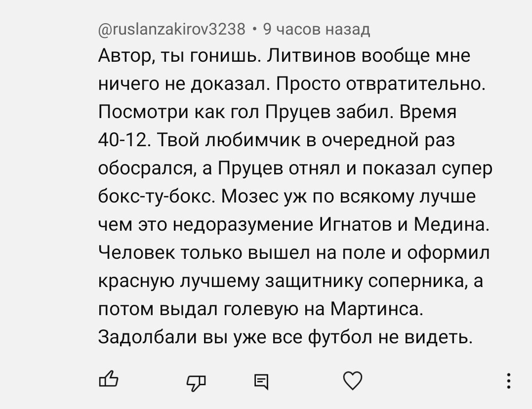 Интересную позицию высказал человек под моим видео, где он принижает заслуги Литвинова в матче с Пари НН и возвышает игру Мозеса. Причем ещё и с обвинениями в том, что я "не вижу" футбол. Пару слов о каждом. Руслан был однозначно одним из лучших на поле в нашем составе. По факту, он был одним из тех, кто "управлял" игрой, чего у нас не было в прошлых матчах. Сразу вспоминаю его филигранную передачу на Игнатова, который не реализовал 100% голевой момент. Сравнивать его с Пруцевым я считаю не уместным - все таки разные функции они выполняли на поле. А ошибки бывают у всех. Если бы их не было, то играл сейчас Литвинов на Спартаке, а в Реале. По поводу Мозеса. Виктор в целом неплохо вошёл в игру, но сравнивать его действия с Мединой, Игнатовым и Литвиновым некорректно. Одно дело, когда ты проводишь весь матч, а другое, когда 14 минут. При всем уважении к Мозесу, но на данный момент он не тянет быть игроком основы. По футбольной технике и выучке он наверное один из лучших в команде, но чт