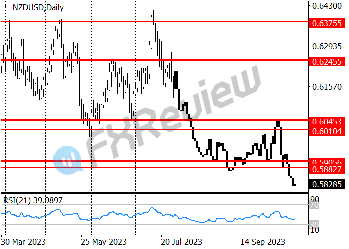 В результате укрепления доллара США вследствие вооруженного конфликта в Израиле пара NZD/USD на прошлой неделе снизилась и закрепилась ниже области 0.5900 – 0.5875, что предполагает продолжение снижения с целью 0.5710. Новозеландский доллар, в свою очередь, слабеет после публикации последних данных по инфляции в Новой Зеландии. Потребительская инфляция за 3 квартал в квартальном выражении составила 1,8%, что оказалось ниже прогноза 2,0%. Инфляция в годовом выражении за 3 квартал составила 5,6%, что также оказалось ниже прогноза 5,9% и ниже предыдущего значения 6,0%. На фоне снижения инфляции Резервный банк Новой Зеландии может прекратить повышать процентные ставки, что будет означать переход от жесткой денежно-кредитной политики к умеренной. Смягчение денежно-кредитной политики, как правило, ослабляет курс национальной валюты. Технический анализ Долгосрочный нисходящий тренд в паре NZD/USD продолжается. На прошлой неделе пара преодолела область поддержки 0.5900 – 0.5875 и закрепилась н