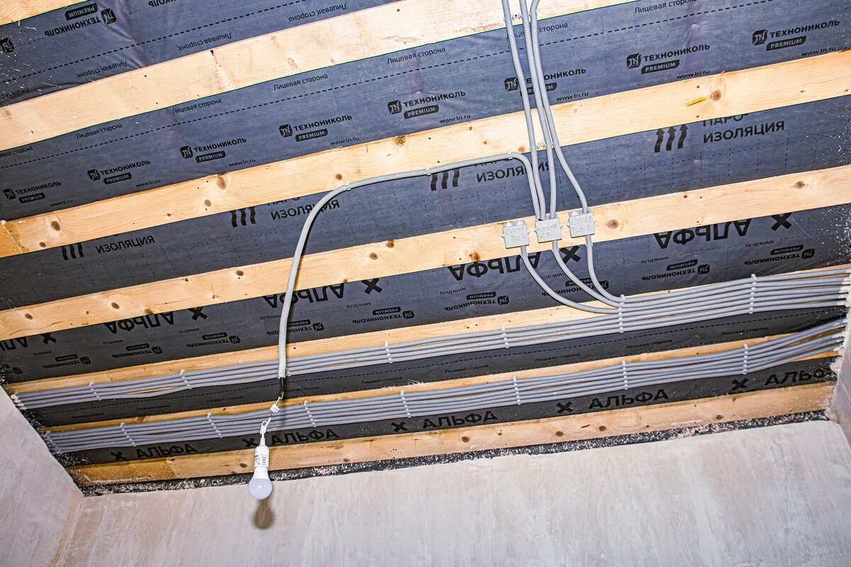 Изоляционная ткань задерживает пар, поднимающийся из санузлов, кухни и всех отапливаемых помещений дома. Защитная плёнка всегда укладывается гладкой стороной к утеплителю. Пароизоляция монтируется на первом слое потолка, если в доме подразумевается холодный чердак. При этом гидроветрозащитная мембрана всё равно должна быть закреплена на кровле. Таким образом, зазор между мембранами может быть равен внутреннему объёму чердачного помещения.