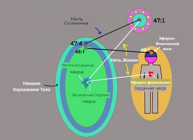 Я еще раз хочу напомнить вам, что каузальное тело, низшее или высшее, существует на каузальном плане. Низшее Каузальное Тело представлено как окружающее три низшие оболочки воплощения. Поскольку они существуют в 1-й Триаде, легко предположить, что наша низшая каузальная оболочка существует там же. Это не так. Если бы это было так, то низшее каузальное тело не смогло бы передать какую-либо информацию обратно в Высшее Каузальное Тело в конце воплощения, когда два тела соединятся. То, что передается Высшему Каузальному Телу – это усвоенные уроки. Что не передается, так это негативные мысли и эмоции. Но они не уходят. Они сохраняются в наших постоянных атомах (48:1 и 49:1) и молекулах (47:4), которые находятся в подсознании. Они всегда там, готовые преследовать вас в другой день или в другой жизни.