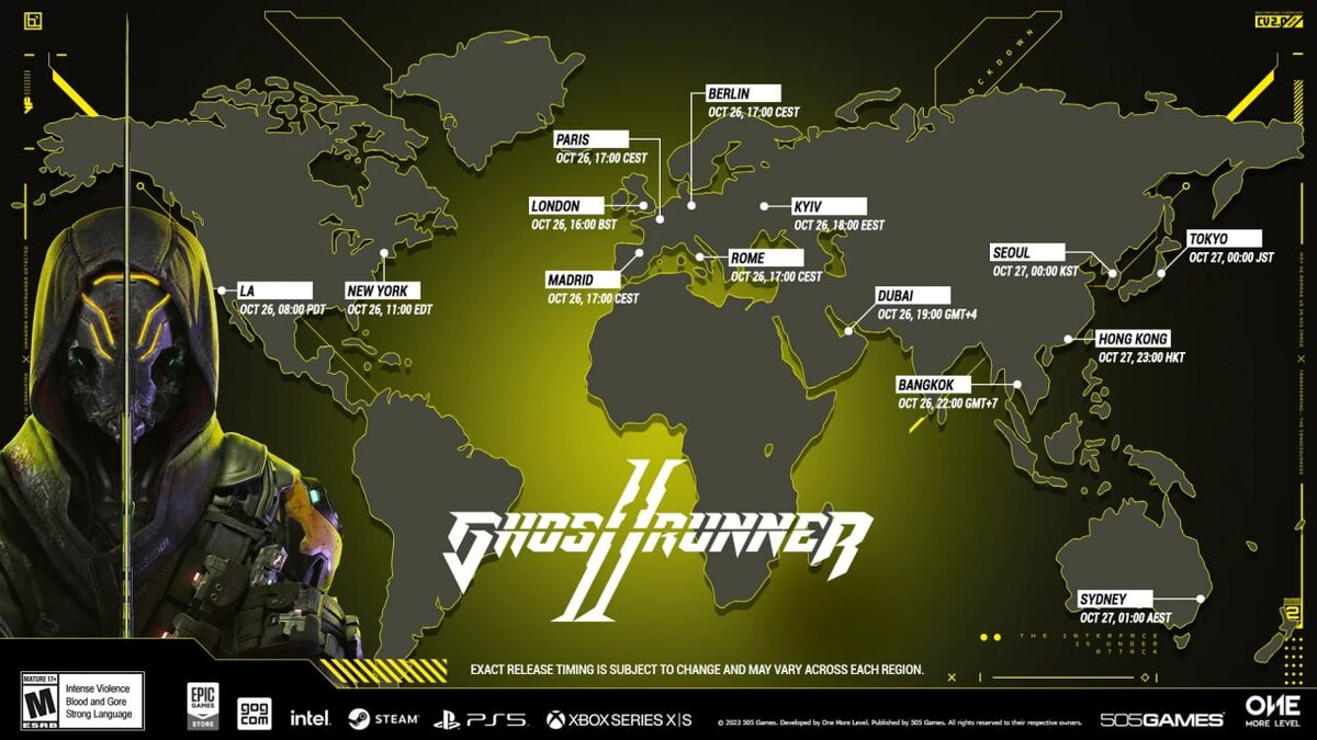 505 Games и студия One More Level представили всемирную карту точного времени выхода киберпанк-экшена Ghostrunner 2.