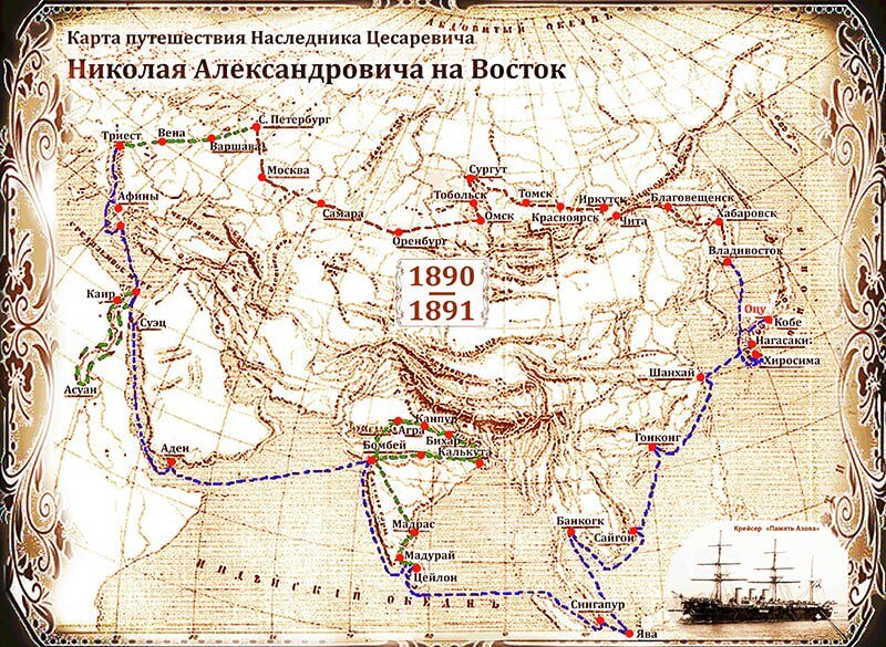 Путь будущего царя пролегал через Псков, Вильно, Варшаву, Вену в Триест, где Цесаревича ждал фрегат "Память Азова", начиналась его морская экспедиция – в Египет через Средиземное море, а затем – через Индийский и Тихий океаны – в Индию, Цейлон, Сиам, Сингапур, Китай и Японию.