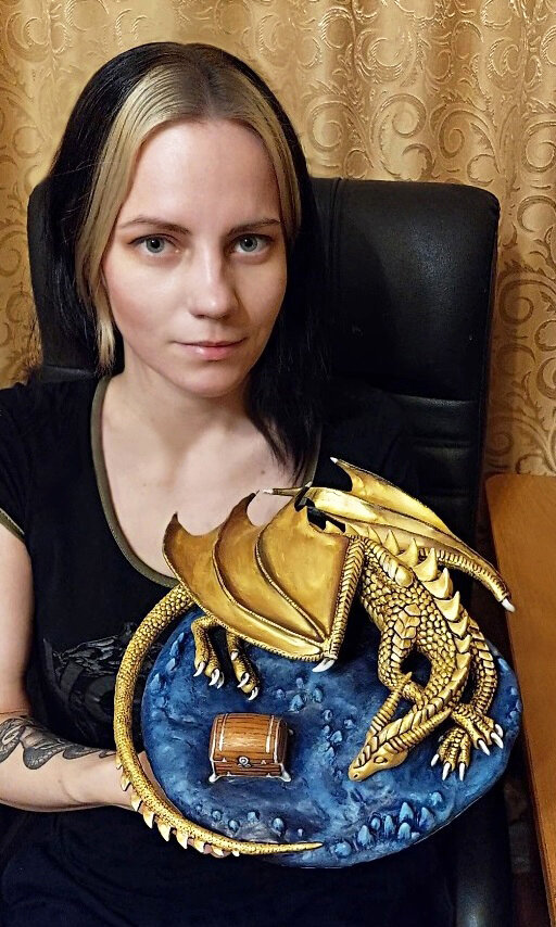 Дракон, уснувший в пещере, рядом с сундуком, в котором лежит нечто ценное. Этот золотой дракон любит пребывать во сне. Часто снятся ему красочные сны с интересными сюжетами и каждый из них по своему прекрасен. Идея человека, для которого я делала эту работу очень понравилась мне. В сундук он положит кольцо. Таким образом будет сделано предложение руки и сердца. Был вариант сделать дракона, который держит кольцо в лапе, но в итоге пришли к тому, что лучше положить его в сундучок. Материалы: полимерная глина, акриловая краска, матовый лак, проволока и фольга в каркасе. Такой вот золотой дракон получился! Скоро родится ещё один чёрный дракон, похожий на того, что я делала ранее, только в этот раз будет с зелёными глазами и немного другими особенностями. Пост автора MarianTraum. Узнать, что думают пикабушники.