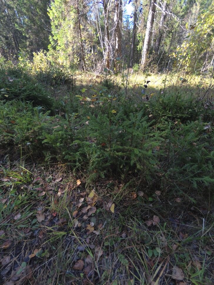 Итак, продолжаю показывать природу в том виде, как это бывает на самом деле и мимо чего мы порой проходим, даже не обращая внимания на эти вещи. Замечу, что все, что будет в этой статье, можно увидеть не только в лесу, но и в городских парках, и даже писать статьи, научные работы, просто наблюдать за процессами. Главное, желание и интерес. Вышел в поход я примерно в 7:00, пошел пешком, за спиной рюкзак под 10 кг. (да, тяжелый, но я люблю с собой много лишнего носить, к чему привык, тут дело каждого). Погода хорошая: И проходя рядом с тропой, по которой люди из одной деревни иногда сокращают путь в поселок, увидел буквально заросли маленьких елочек. Только представьте, через что им пришлось пройти: А в сезон грибов, рядом с этими елочками, которые пока пушистые и нежно зеленые, можно наблюдать и маслят. Конечно же, в борьбе за выживание, не все они станут большими деревьями, но именно вот так, ствол к стволу, переплетаясь корнями, они и дадут ход жизни нескольким деревьям. А это уже отж