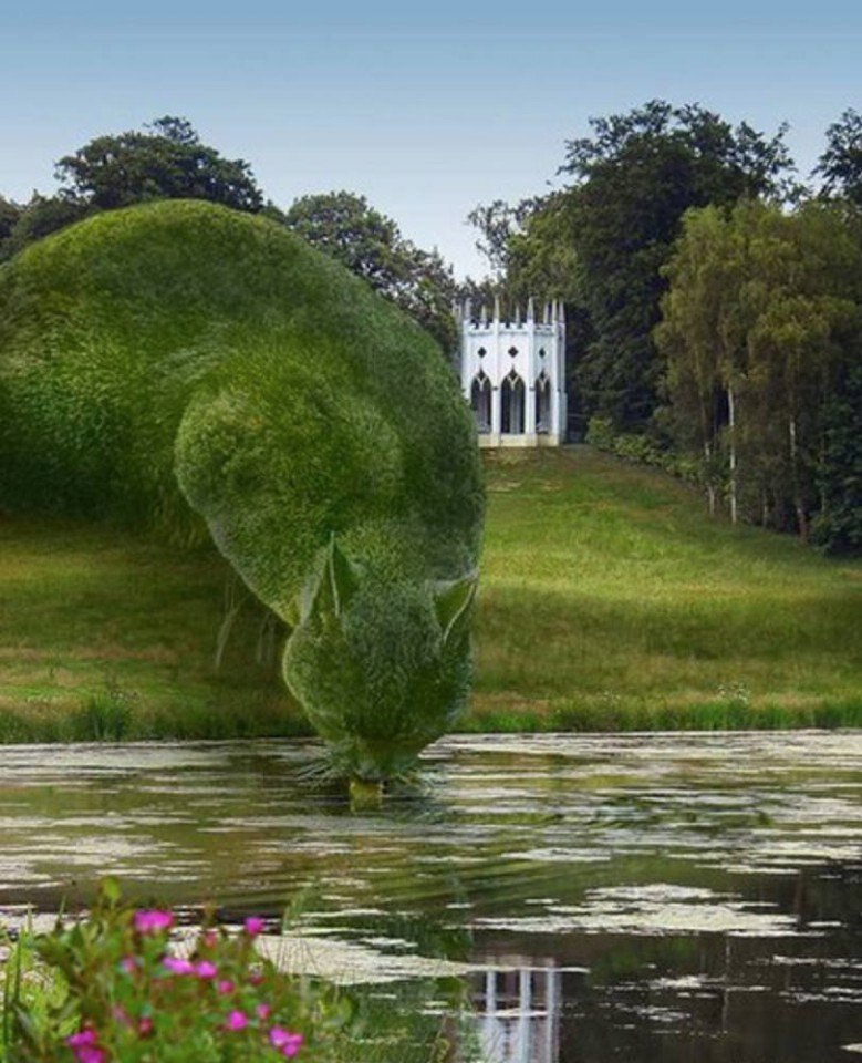 Ричард Сондерс – художник из Англии, творит невероятные композиции и подает топиарное искусство в совершенно необычном виде. В феврале 2016 года из жизни ушел кот Ричарда по кличке Толли породы русская голубая. Как любой хороший хозяин, художник тосковал по своему питомцу. Однажды Ричард увидел декоративный кустарник и был поражен тем, насколько по форме он напоминал его любимого кота в спящем виде. Тогда Сондерс начал создавать необычные фотоколлажи, размещая огромные «котокусты» на снимки парков и других живописных мест Англии. К удивлению Ричарда его работы быстро обрели популярность и начали разлетаться по соцсетям с невероятной скоростью. И хотя изначально он не задумывался о том, что на проекте можно заработать, сейчас его проект The Topiary Cat приносит владельцу не только удовольствие, но и прибыль. В своих комментариях, люди пишут, что хотели бы чтобы эти объекты существовали в действительности. А около 25% людей так и продолжают верить в реальность котокустов,