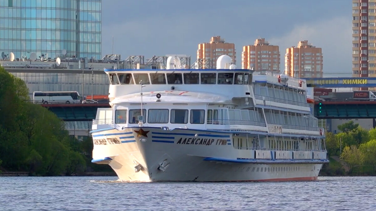 Теплоход «Александр Грин» прибывает в Москву. Это очень удобный трехпалубный речной теплоход.