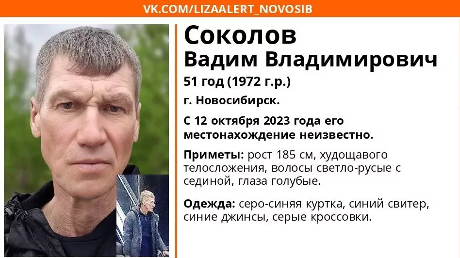 В Новосибирске пропал 51-летний Вадим Соколов. Об этом сообщили в поисковом отряде «ЛизаАлерт». С 12 октября 2023 года его местонахождение неизвестно. Известно, что в день исчезновения он был одет в серо-синюю куртку, синий свитер, джинсы и серые кроссовки. Приметы: рост 185, худощавого телосложения, волосы серо-русые с сединой, глаза голубые. Если вам что-либо известно о местонахождении пропавшего, сообщите, пожалуйста, по телефону горячей линии отряда 8-800-700-54-52 (круглосуточно, бесплатно) или по номеру 112. Ранее мы писали о том, что ищут 10-летнего мальчика, ушедшего из дома в неизвестном направлении. Надежда Карпеко