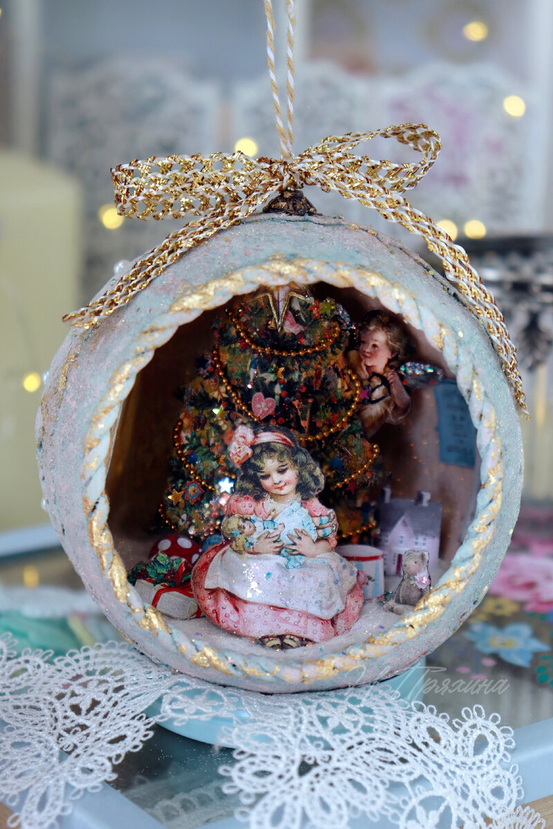 Шар изготовлен из ваты, декорирован золотой поталью и кружевом. Композиция внутри - картонаж с распечатками репродукций старинных открыток. Хотелось побыть капельку Дроссельмейером и хотя бы прикоснуться немного к этому сказочному волшебству.