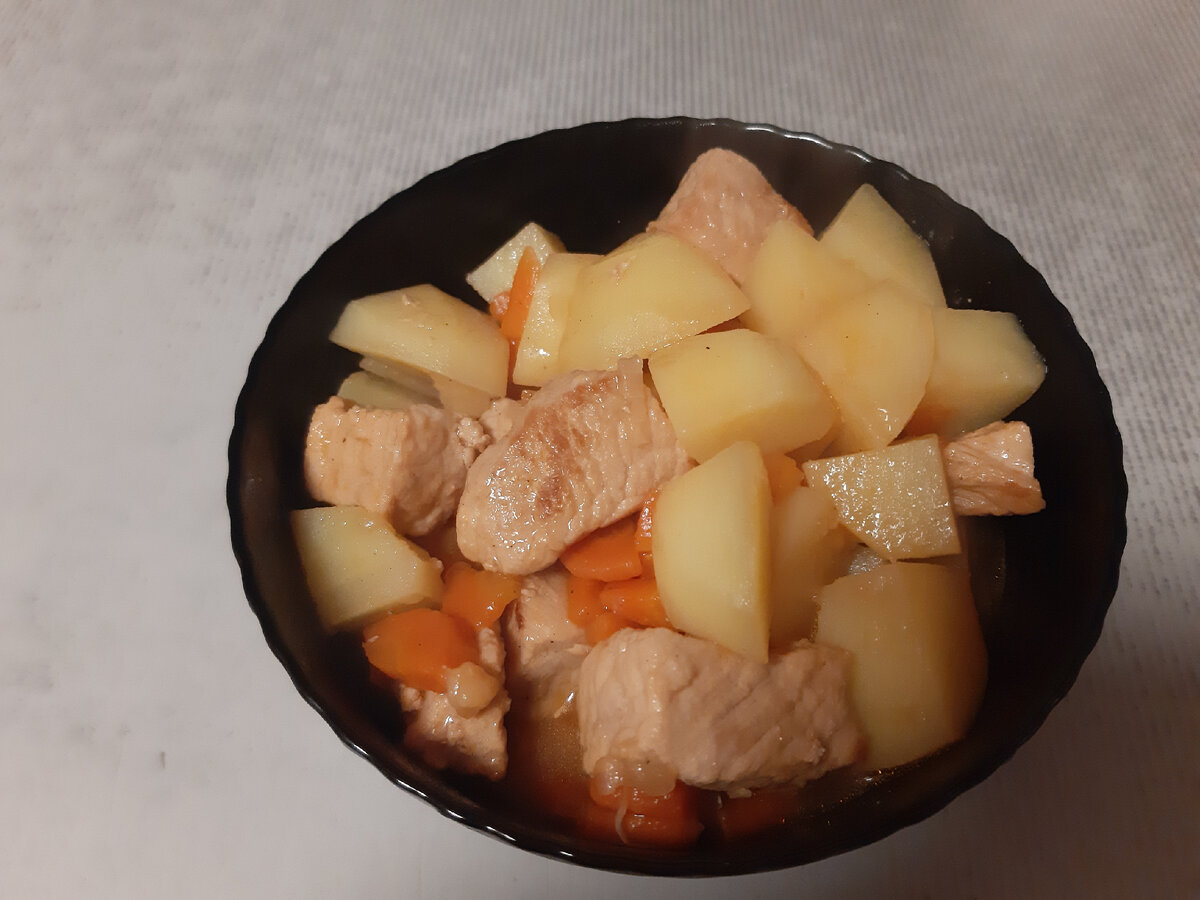 Тушеная картошка с мясом в кастрюле – очень сытное, аппетитное блюдо. Готовится оно довольно просто и быстро, а в результате получается очень сытный полноценный обед. Ингредиенты: Свинина(у меня карбонад,можете взять любую часть от свинины на свой вкус)-800-900 гр Картофель-1 кг Морковь -у меня 2 небольших шт Лук репчатый-1 шт(у меня крупная луковица,поэтому половина головки) Мука-1 ст.ложка Томатная паста(или кетчуп)-3 ст.ложки Растительное масло для жарки Соль и специи на ваш вкус Пошаговая инструкция: 1.Для начала подготовим все необходимые ингредиенты. 2.Чистим репчатый лук и режем полукольцами. 3.Чистим морковь и режем небольшой соломкой. 4.Чистим картофель и режем как вам нравиться(у меня кубиками). 5.Мясо промываем и промокаем бумажными полотенцами.Режим кубиком. 6.На среднем огне разогреваем сковороду и добавляем растительное масло.Добавляем мясо и жарим 10 минут до золотистой корочки. 7.После того как мясо поджарилось до золотистой корочки,добавляем лук и жарим 2-3 минуты. 8.