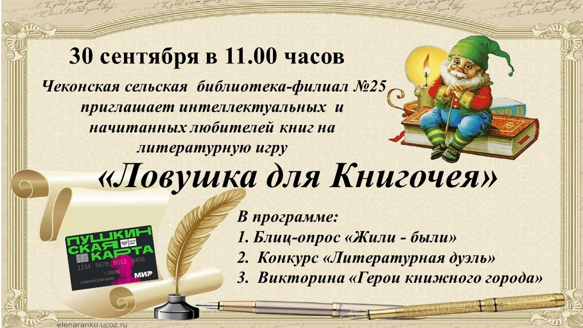 Литературная игра «Ловушка для Книгочея» Суть литературной игры заключается в том, что участники будут отгадывать имена литературного героя, поэта или писателя, которые указаны на их карточке. Их задача задавать как можно больше вопросов, чтобы сузить круг лиц и найти нужный персонаж. Проигравших в этой игре не будет! Каждый участник сможет расширить свой кругозор, проявить свою смекалку, получить заряд бодрости и хорошего настроения! Заведующий Чеконской сельской библиотекой-филиалом №25 ________ С. В. Захлюпа