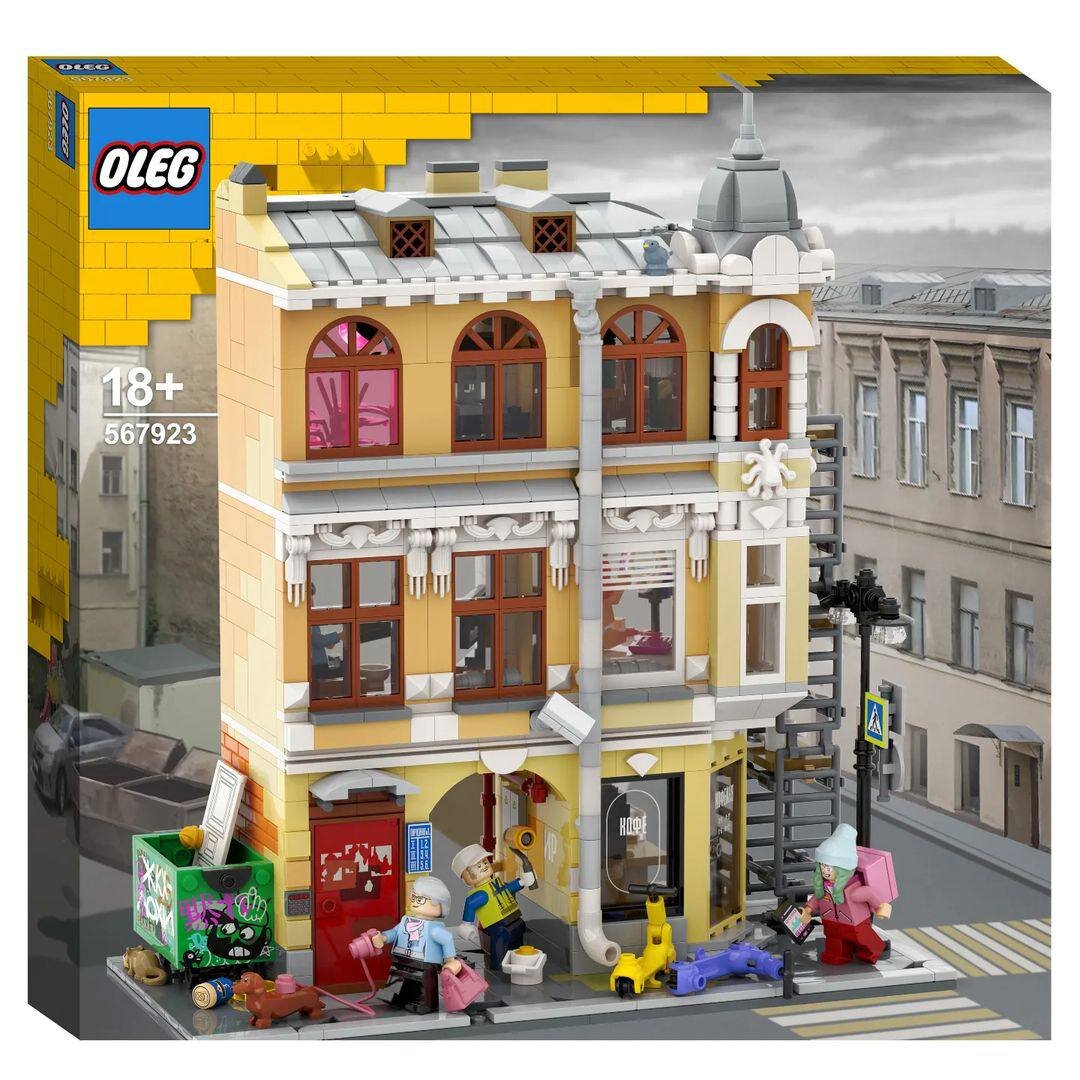 LEGO от OLEG'a. Известный дизайнер вновь порадовал своим видением конструктора. На этот раз нам представили "реалистичный" Питер. Набор представляет из себя классический дом этого прекрасного города. Дом очень хорошо выполнен и весьма детализирован. Радует детализация фасада дома, облицовочная лепнина, которая выполнена из деталей пера, "когтей" и осьминога. На первом этаже, имеется кофе-булочная, которых очень много в городе. Также изображена парадная, с номерами квартир и дверью, на которой оторваны объявления. Но самое главное в этом наборе это антураж, который заполняют персонажи этого дома. Строитель, который должен реставрировать дом, но подсматривает в окно за жительницей дома. На улице мы видим девушку из службы доставки, которая явно спешит доставить заказ. Валяющиеся самокаты на дороге и поребриках. Дворник которые закрашивает надпись "МИР" и женщина выгуливающая собачку. Но самое точное попадание это жильцы дома. Тут всё максимально детально и похоже, начиная от на