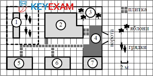 СКАЧАТЬ ОТВЕТЫ НА МЦКО При входе на участок находится заасфальтированная площадка, отмеченная на плане цифрой 4. Справа от площадки имеются яблоневые посадки, отмеченные на плане цифрой 3. Слева к площадке примыкает гараж. Площадь гаража равна 24 кв. м. Самое большое по площади строение – жилой дом. Это единственное строение в домохозяйстве не прямоугольной формы. Также дом отличается от