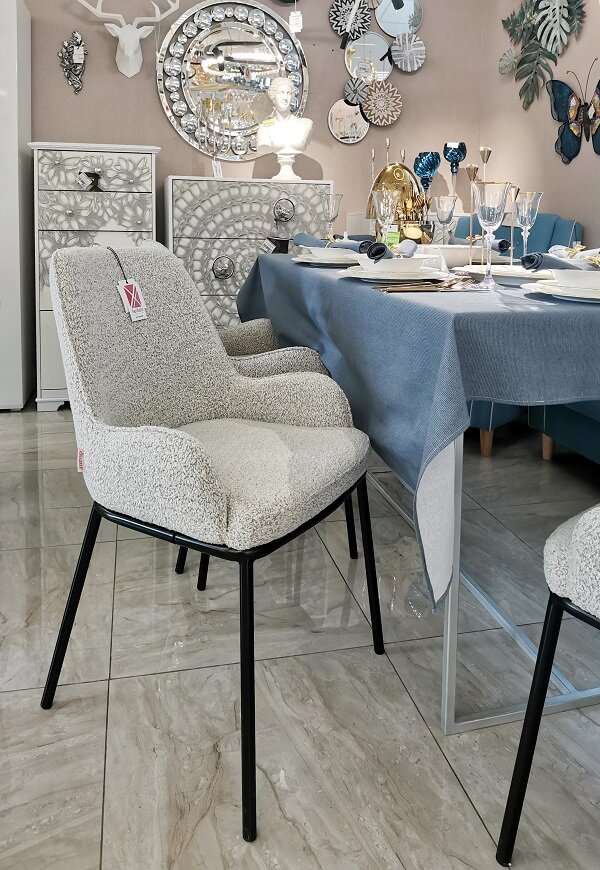 Как изменчивы в своих пристрастиях женщины! Слово "мода" женского рода. А значит эта особа любит перемены. И это действительно так. Каждый сезон дизайнеры придумывают все новые сочетания цветов, фактур и линий. В тенденциях последнего времени оформление интерьеров обеденных зон в уютных цветах и тканях. Популярны вариации ткани букле в молочных и бежевых оттенках. Форма ножек максимально простая. И тем самым все внимание приковано к форме сидения и спинки стула. Модель на фото ниже умиляет формой, хочется присесть и утонуть в объятьях мягкости и комфорта. Чудесно будет смотреться также в гостиной. Лаконичная модель стула с интересной спинкой представлена в ассортименте интерьерного центра Уют Холл. Выгодно отличается возможностью легко переместить стул благодаря ручке на спинке. Идеально сочетание цвета обивки и ножен - черно-белая классика. Форма и обивка стульев на фото ниже переносит в 40-50е годы прошлого столетия. Классическая отстрочка ромбом на спинке, удобные подлокотники и гл