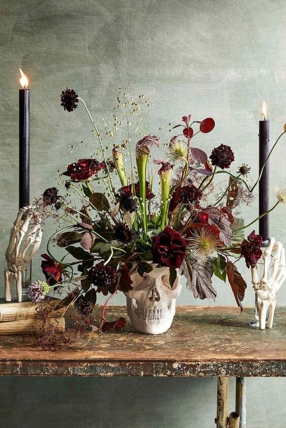 В этой статье мы рассмотрим различные варианты украшения дома цветами и поделимся идеями удивительных композиций к Хеллоуину!🎃 Композиции из цветов в вазах 🎃 Одним из самых простых и красивых способов украсить дом к Хеллоуину является создание интересной интерьерной композиции из цветов в вашей любимой вазе - если ваза прозрачная, можно положить на ее дно любой "жуткий" керамический декор, а сверху расположить цветы или сухоцветы. Для придания дополнительного эффекта можно обзавестись бутылками с подтеками воска или тематическими вазами - например, приобретите гипсовое кашпо в форме черепа.