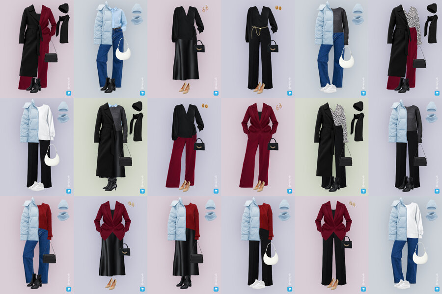 Из этого набора я собрала 24 образа на каждый день (в офис, на прогулку, встречу с друзьями) и 6 образов на выход (на день рождения, в ресторан и т. д.)