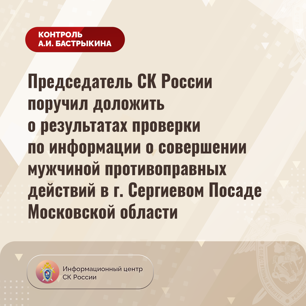 Председатель Следственного комитета Российской Федерации Александр Иванович Бастрыкин поручил руководителю ГСУ СК России по Московской области Александру Юрьевичу Старикову представить доклад о предварительных и окончательных результатах процессуальной проверки, поставив ее на контроль в центральном аппарате ведомства.