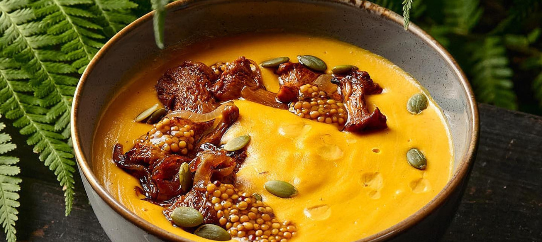 Бессменная классика сезонных меню во многих заведениях. Мы выбрали вариант зеленоградского ресторана «Телеграф»: на берегу Балтики блюдо готовят с лисичками, угольным маслом и горчичными семенами. В этом ресторане год от года тыквенный суп представляют в новом прочтении: например, в 2022 году в составе была алыча, балтийский угорь и «чёрный» мёд.