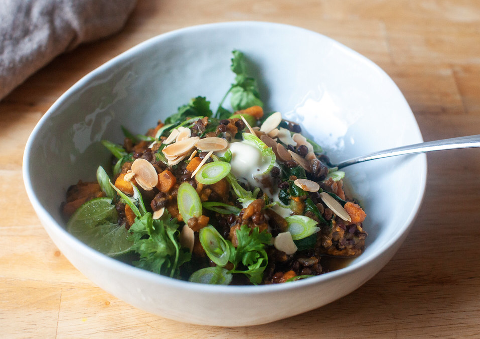 Веганский пряный салат, который удивит своими сочетаниями вкусов и хорошо насытит вас в любое время дня. Богат полезными витаминами и микроэлементами, поэтому он не только вкусный, но и очень полезный. Попробуйте приготовить! Ингредиенты: Приготовление: 1. В среднюю или большую кастрюлю добавьте оливковое масло и разогрейте на среднем огне. Добавляйте нарезанный мелким кубиком репчатый лук и жарьте пока лук не станет прозрачным, 5-8 минут, периодически помешивая. Далее добавьте мелко нарубленные чеснок и имбирь, гарам масалу, порошок карри и так же нарубленный мелко перец халапеньо (если используете). Готовьте, помешивая, 1 минуту. 2. Добавляйте далее в кастрюлю 800 мл овощного бульона, кубиками порезанный батат, чечевицу и лавровый лист. Увеличивайте огонь до сильного и подождите пока закипит. Когда закипит, убавляйте огонь до среднего, частично накрывайте кастрюлю крышкой и варите 15-20 минут, в зависимости от времени приготовления чечевицы. 3. Добавьте тонко нарезанный мангольд, сол