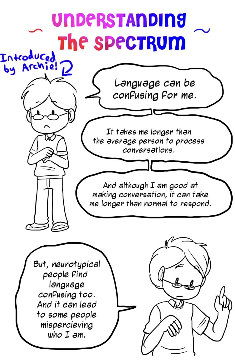 Дорогие мои читатели, расскажите, пожалуйста, как вы представляете себе “спектр аутизма”? По моим наблюдениям, чаще всего это прямая шкала, по которой может двигаться человек с аутизмом от более легкого к более тяжелому и обратно. Но спектр, на самом деле, это не прямая шкала. И я хочу с вами поделиться комиксом, который очень наглядно объясняет, что же из себя представляет спектр аутизма. Автор комикса Rebecca Burges. Перевод с английского мой. На правильность не претендую. Просто хочу, чтобы как можно больше людей прочли и, возможно, поняли то, что раньше им казалось таким сложным и непонятным. Речь может сбивать меня с толку. Мне требуется больше времени, чем обычному человеку, чтобы обработать разговоры. И хотя я хорошо умею вести беседу, это может занять мне дольше обычного, чтобы ответить. Но у нейротипичных людей речь тоже порой вызывает сложности. И это приводит к тому, что некоторые люди неправильно воспринимают кто я есть. ——- Вот почему я хотел бы объ