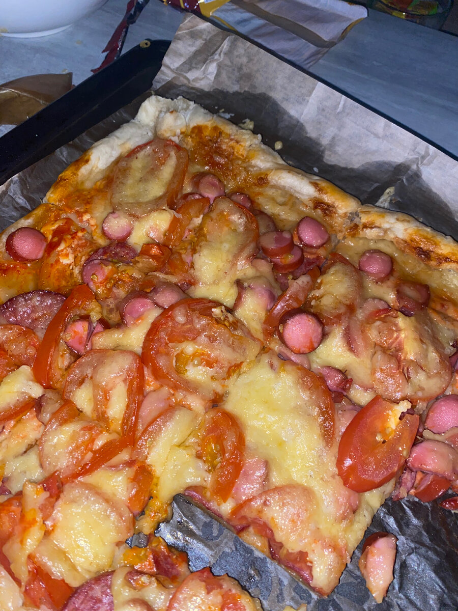 Сегодня мы с вами приготовим очень вкусную и при этом простую пиццу в духовке 🍕Ингредиенты🍕 Начинаем с того, что размораживаем тесто. Мы его просто оставили на столе на час. Дальше раскатываем его и делаем такой формы какую вы бы хотели видеть пиццу у нас был квадрат, так же, можно в форме сердца, стандартную круглую, можно и в форме креста, все зависит от вашей фантазии. После этого смешиваем кетчуп и майонез и размазываем по тесту. Теперь можно выкладывать на пиццу всю начинку, ее можно и поменять, мы сделали из того, что было в холодильнике, так же можно и огурчики и разные сыры использовать, опять же, все от вашей фантазии. Выкладываем все, кроме, сыра, его натираем на терке и посыпаем им за 5 минут до готовности пиццы в духовке. Так же, решили попробовать сделать сырный бортик, выложили сыр на край теста и завернули, но допустили ошибку, лучше туда выкладывать уже натертый сыр! После всех наших процедур, ставим пиццу в духовку при 180 градусов на 20 минут, проверяем по гот