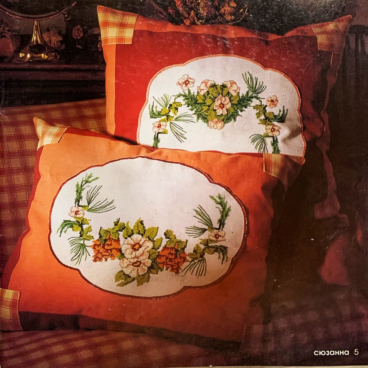 Для вас мастер класс и схемы для вышивки подушек и скатерти. Зимние розы, сосновые шишки и иголки, еловые ветки: вот из чего состоят букеты в домике в горах. На овальных лоскутах канвовой ткани Aida я выполнила вышивку, которую затем нашила на центр подушек, а уголки обшила в тон дивана. Интерьер дополняет скатерть в том же стиле. Подушки Что будет нужно Для подушек потребуется: Для вышивки: Распечатайте схемы, купите мулине необходимых цветов, заправьте канву в пяльцы, отметьте контуры вышивки простым карандашом и можно начинать вышивать. Если вам не нравится вышивать на канве Aida, купите одноразовую канву и вышивайте на белом хлопке. Когда вышивка будет готова, выдерните канву по одной нитке за раз и проутюжьте. Когда вышивка будет готова, обработайте края роликовой строчкой на оверлоке или частым зигзагом. Выкроите два лоскута из ткани цвета ржавчины 55x50 (схема F) и два лоскута розового цвета 55x44 (схема G). Приутюжьте к вышивке клеевой влизелин с изнанки. Нашейте вышивку в