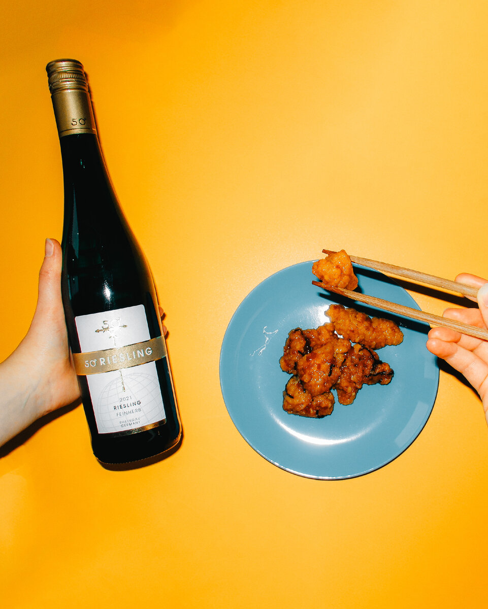 Цыплёнок Кунг Пао, он же гунбао — архетипический рецепт курицы в кисло-сладком соусе, классическое блюдо сычуаньской кухни Китая конца XIX века, изобретённое знатным придворным гурманом Дин Баочжэнем и названное в память о его должности воспитателя наследника императора. Чили и чеснок, апельсиновый сок и имбирь, зелёный лук и болгарский перец, а также неизменная маринованная курица — баланс сладости и пикантности требует адекватного винного сопровождения. От Пекина до Рейнгау полтора десятка тысяч километров пути, но полусладкий рислинг 50' Riesling отлично поддержит кисло-сладкого цыплёнка. Мягкая ароматика апельсинов и белых яблок, уверенный остаточный сахар, отлично сбалансированный сочной кислотностью, а также осторожный и вкрадчивый петрольный тон — идеальная гамма для того, чтобы почтить память воспитателя Дин Баочжэня.